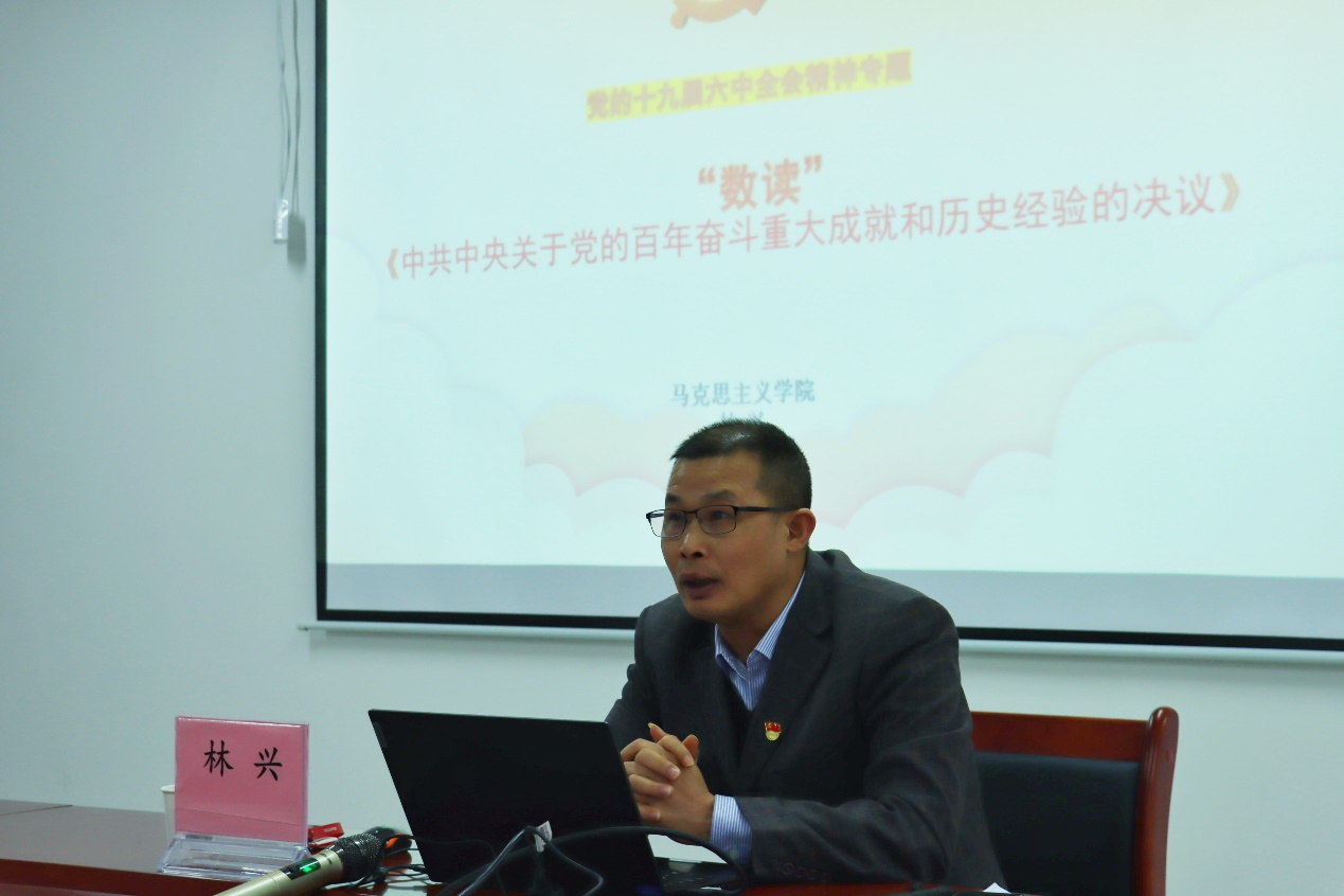 邱飞表示党的十九届六中全会是在重要历史关头召开的一次具有重大历史意义的会议,会议审议通过了党的重要纲领性文件,对于十九届六中全会的学习及相关文件的理解是极其必要的。他特别强调要学懂弄通做实习近平新时代中国特色社会主义思想,林兴副教授以丰富的理论研究成果和实践教学经验深入浅出的带来此次宣讲,内容丰富多彩,值得每个人细细思考,不断总结,从中汲取精华落实到工作学习的方方面面。