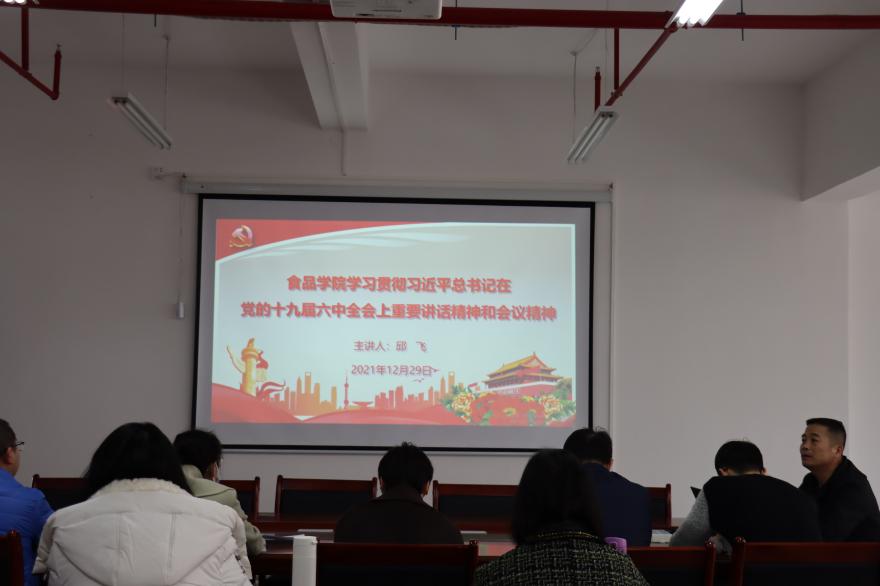 12月29日,食品科学与工程学院于第五教学楼B栋318室举行学习贯彻党的十九届六中全会精神会议,学院各支部委员参加会议,会议由党委书记邱飞主持。