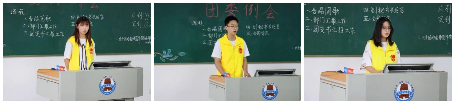 会上,团支部代表董小雄表示,20食安团支部自开学以来积极开展学院团委组织安排的入党推优等各项活动,认真完成班级资料收集等各项工作。随后,团委各部门派干部代表依次进行开学以来的主要工作汇报,各部门负责人履行工作职责,带领各团支部认真地落实学院交办的工作任务。