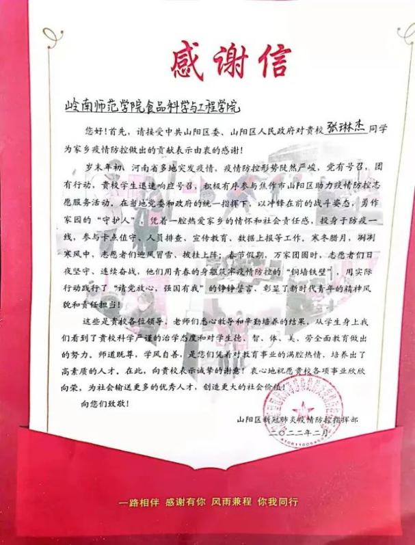 食品学院获山阳区人民政府感谢信