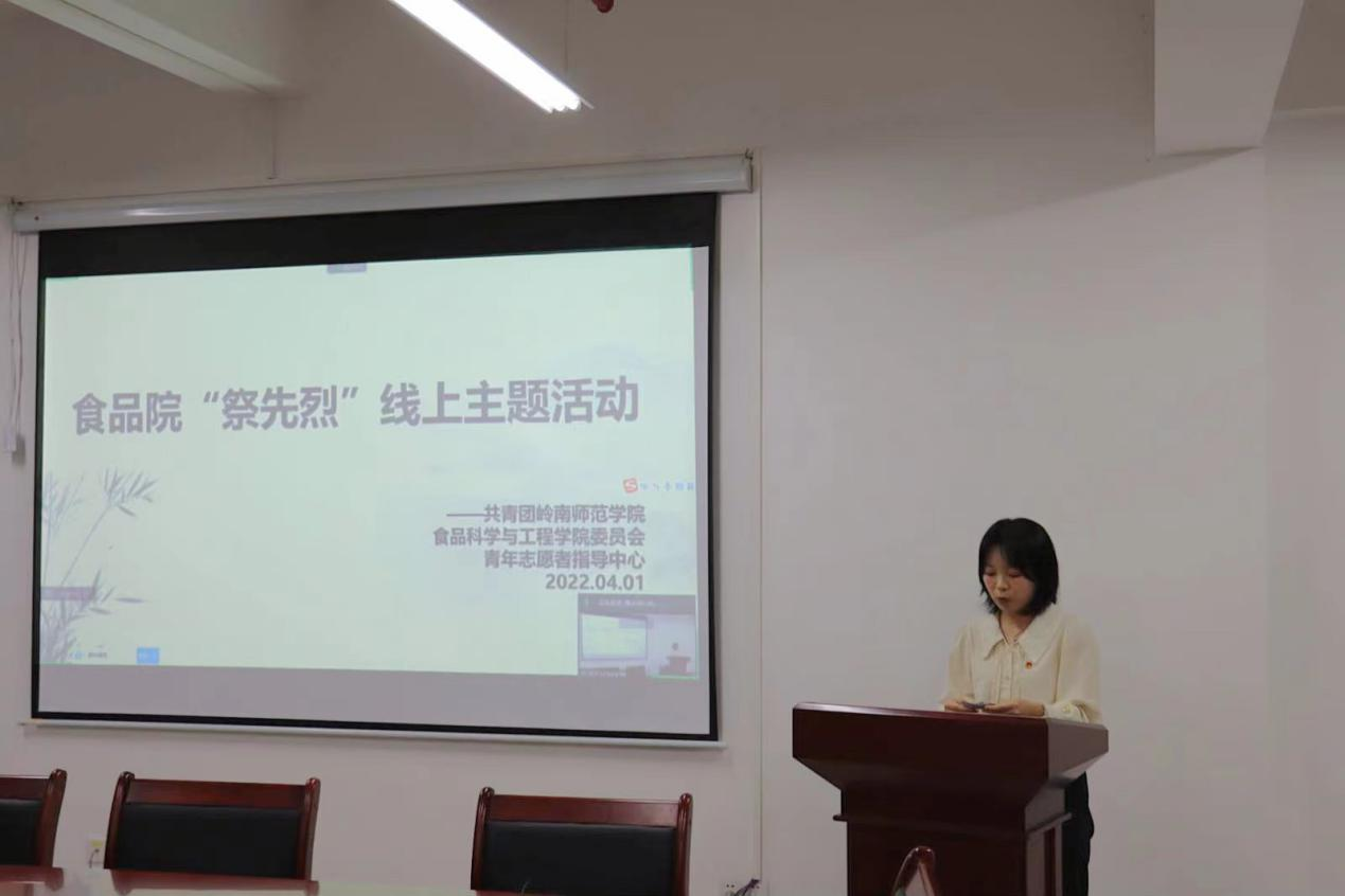 为缅怀先烈功勋,弘扬先烈精神,激励同学们传承革命先烈的红色基因,进一步增强爱党、爱国的情怀,4月1日晚,在第五教学楼B栋318室,食品科学与工程学院举办“祭先烈”主题活动。出席此次活动的有辅导员姚其元及19级—21级全体团员,本次会议由团委青志导副部长黄校灵主持。