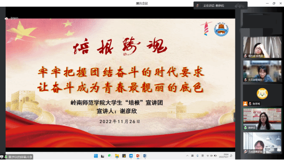 11月27日晚,“培根”宣讲团成员谢彦欣在线上开展以“牢牢把握团结奋斗的时代要求,让奋斗成为青春最靓丽的底色”为主题的宣讲活动。出席本次活动的嘉宾有团委副秘书长林家善和郭锦铧以及团委的所有干部,会议由22级烹饪与营养教育1班的符方伟主持。
