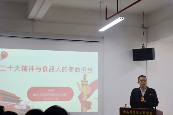 3月9日上午,食品科学与工程学院副院长王标诗(主持行政全面工作)于第五教学楼B栋318室围绕主题《党的二十大精神与食品人的使命担当》开讲思政第一课,带领大家回顾党的二十大召开的内容,深刻理解党的二十大召开的意义,详细阐述二十大报告中有关大食物观相关内容,最后指出当下食品人面临的使命与担当。聆听本次思政课的有22食科班和22食安班学生。