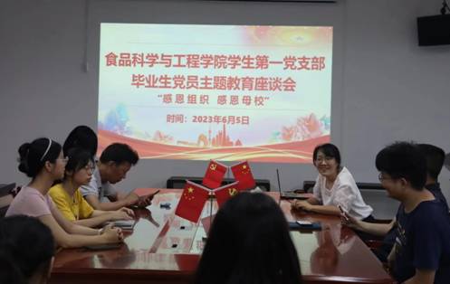 为推进学习贯彻习近平中国特色社会主义思想主题教育走深走实,加强学生党员毕业离校前的教育,勉励学生党员“不忘初心、牢记使命”,在今后的学习、工作中始终做好表率作用。6月5日,食品科学与工程学院学生第一党支部于第五教学楼B栋318室举行毕业生党员主题教育座谈会,出席本次会议的有党委书记邱飞、主持行政全面工作副院长王标诗、副书记刘淑芬,副院长胡小军,正处级辅导员郑侯锦,学生党支部书记袁嘉渝以及学生第一党支部成员,会议由刘淑芬主持。