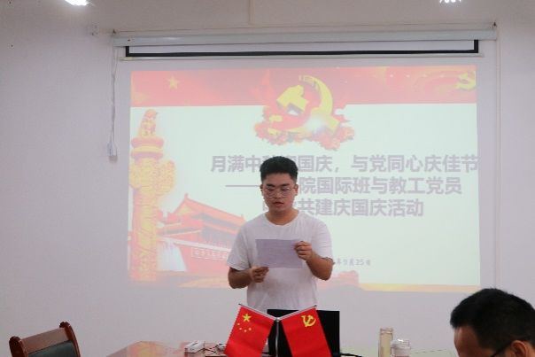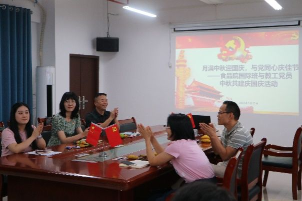 秋色如许,双节同辉,在这秋高气爽的金秋时节,为庆祝新中国成立74周年、迎接中秋佳节,9月25日上午,食品科学与工程学院于第五教学楼B栋318室举行中外合作办学班与教工党员中秋共建庆国庆活动。参与活动的有党委书记邱飞、副院长王标诗(主持行政全面工作)、党委副书记刘淑芬、副院长胡小军、专业教师杨娟、李锐、黎俏灵、李春兰、张国强、辅导员袁嘉渝、苏琳、由田以及22级食品院国际班学生。活动由22级烹饪国际2班叶佩怡主持。