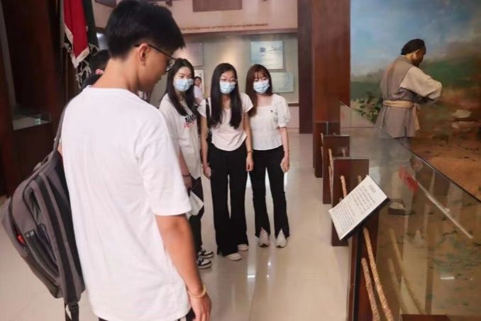 党员们参观抗日战争展厅,了解湛江的历史起源与发展以及湛江人民共同抵御外来入侵者的历史故事。展厅里的文字和文物记录着一代又一代的进步青年学生掀起一场又一场轰轰烈烈的学生运动。除此之外,党支部成员在非物质文化遗产展厅也了解到醒狮、石狗雕、木偶戏、傩舞等湛江特色文化,博物馆通过图片、实物、泥塑、墙绘等方式,对湛江非遗保护成果进行展览,浓缩了湛江独特的风土人情,展示地方底蕴和文化。