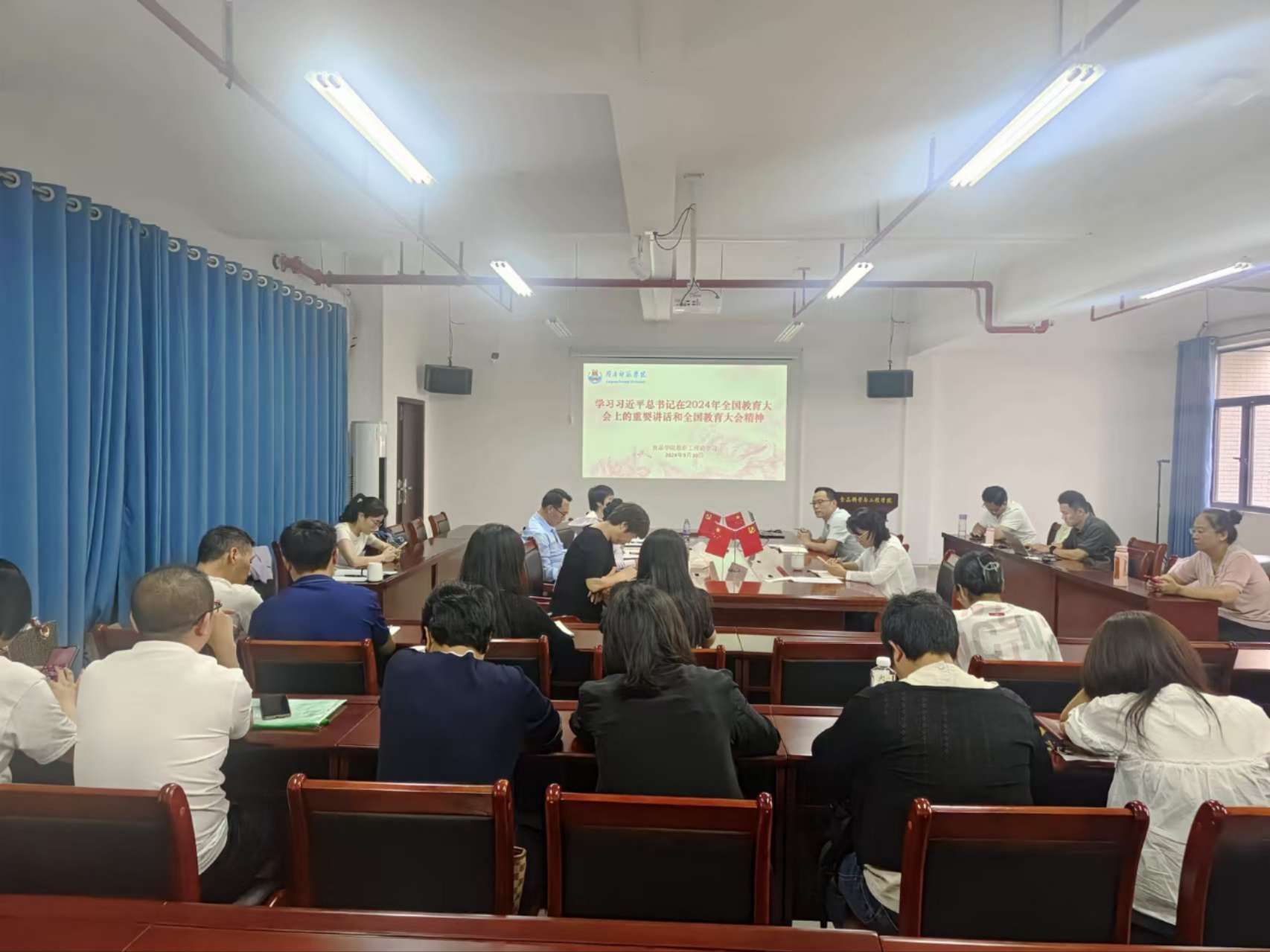 党委副书记刘淑芬带领与会人员深入学习党的二十届三中全会精神。她围绕“深刻领会全会精神的重大意义”、“准确把握全会精神的核心要义”、“紧密结合学院实际,推动全会精神落地生根”三方面,具体阐述党的二十届三中全会精神的核心意义。她指出,党的二十届三中全会是在全面建设社会主义现代化国家新征程上召开的一次十分重要的会议,对于进一步解放思想、锐意进取,全面推进学院各项工作具有重要的指导意义,全会精神的核心要义在于进一步全面深化改革,推进中国式现代化。她强调全体教职工要紧密结合学院实际,将全会精神落实到学院发展的人才培养、科学研究、社会服务及国际合作等方面,必须坚持以习近平新时代中国特色社会主义思想为指导,深入贯彻新发展理念,加快构建新发展格局,推动办学事业高质量发展。