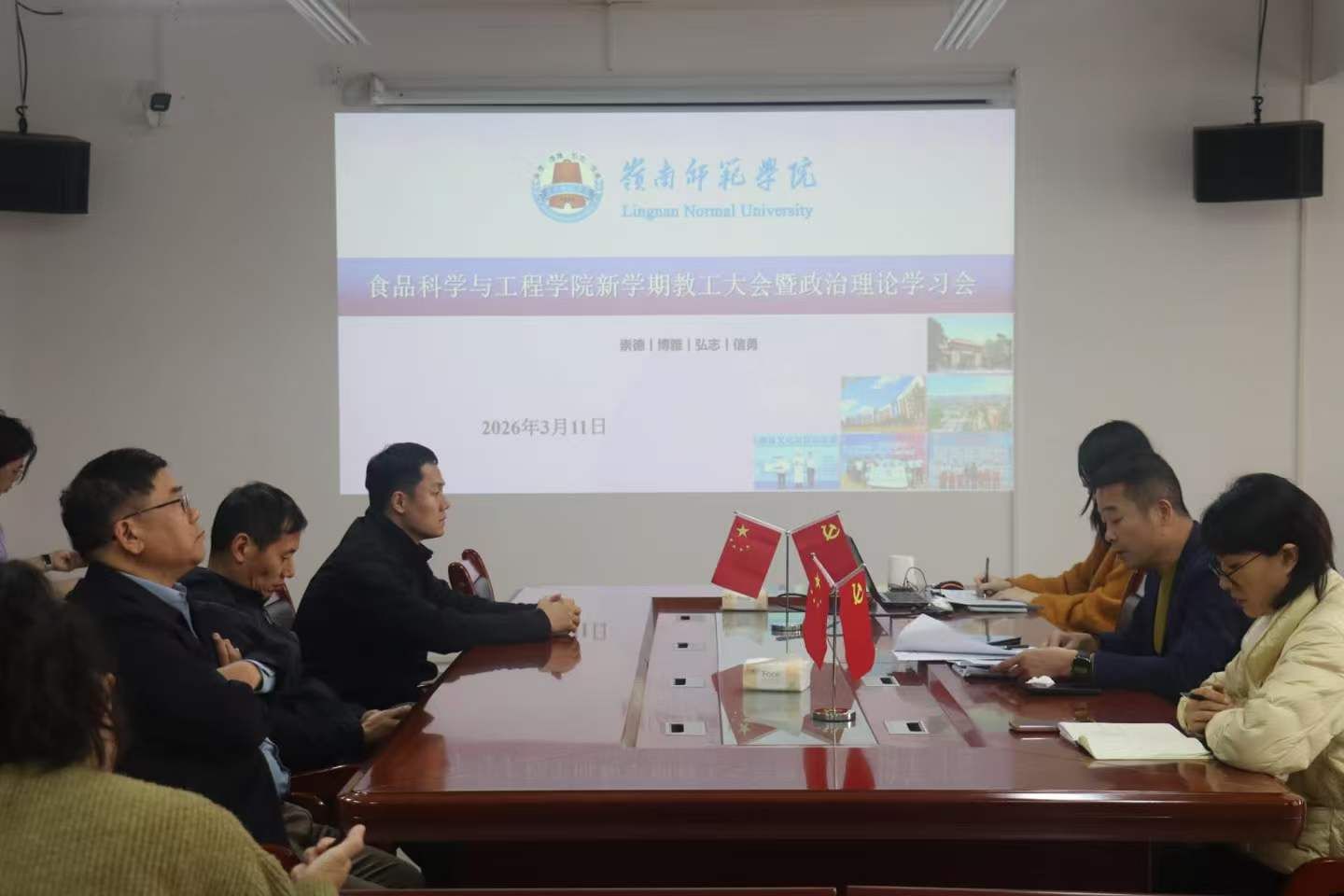 为深入贯彻学校和上级关于全面从严治党及学校2026年度工作会议精神和部署,引导广大教职工准确把握新形势新要求、及时了解学校重点工作部署以,更扎实作风和更高责任感为学院高质量发展提供坚强保障。3月11日下午,食品科学与工程学院在第五教学楼B栋318召开新学期教职工大会暨政治理论学习会。食品学院全体教职工参加会议,会议由党委书记邱飞主持。