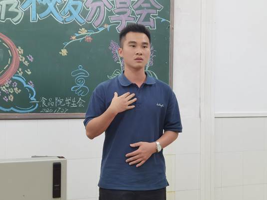 郑土周表示,报考烹饪与营养教育专业是偶然。他分享了自己大学服兵役的日子,收获成长的同时发现自己更喜欢也更适合烹营专业的学习,通过不懈的努力成为了烹饪教师。并根据自己四年的学习与探索经验勉励同学们要积极乐观,尽早地设立自己的目标,始终相信越努力,越幸运。最后,他以“岭师烹饪是一家,发扬光大靠大家”结束自己的演讲并提出了自己对师弟师妹们的期待:人不仅要有想法,还要敢于行动,敢想敢做,不要给自己留遗憾。
