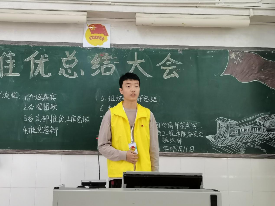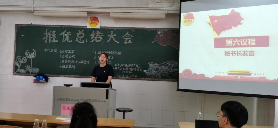 在全体成员起立歌唱团歌《光荣啊,中国共青团》中,推优大会拉开帷幕。18、19、20级各团支部以PPT讲解的形式从支部推优情况、推优成功人员信息以及推优总结三方面进行汇报。总结发言时,各支部团支书都分析了此次班级推优大会的优点与不足,表示会加以改进并对下一次推优会议的召开提出展望。