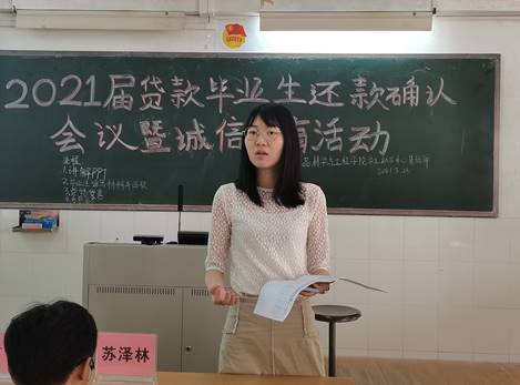 会议伊始,贷款部干部邓淇方首先为贷款生进行诚信教育,强调了诚信还款的重要性。接着,她对国家助学贷款还款政策进行解读,讲解《2021届贷款毕业生须知》的通知。此外,她在介绍学生在线系统功能时,还详细讲述了还款流程和还款的相关操作,并明确地提醒贷款生在毕业离校前后需要完成的内容和注意的事项。