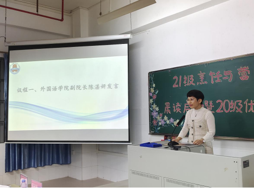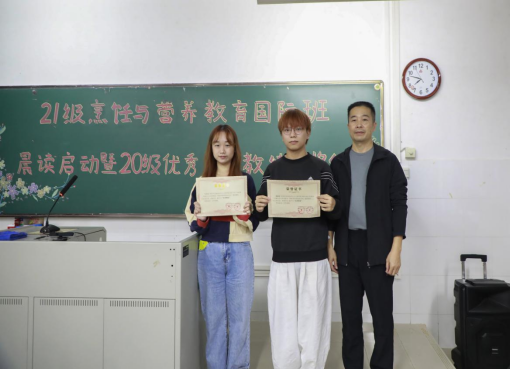 10月24日晚,食品科学与工程学院21级烹饪与营养教育国际班晨读启动暨20级优秀晨读教练颁奖仪式于燕雷楼D栋102室举行,外国语学院副院长陈湛妍、专任教师庞宇艳,学院党委书记邱飞、副院长王标诗(负责行政全面工作)、专任教师黄亚芬与李恒、辅导员袁嘉渝出席会议。本次会议由20级烹饪与营养教育国际2班张晓霖和21级烹饪与营养教育国际1班唐晓寅主持。