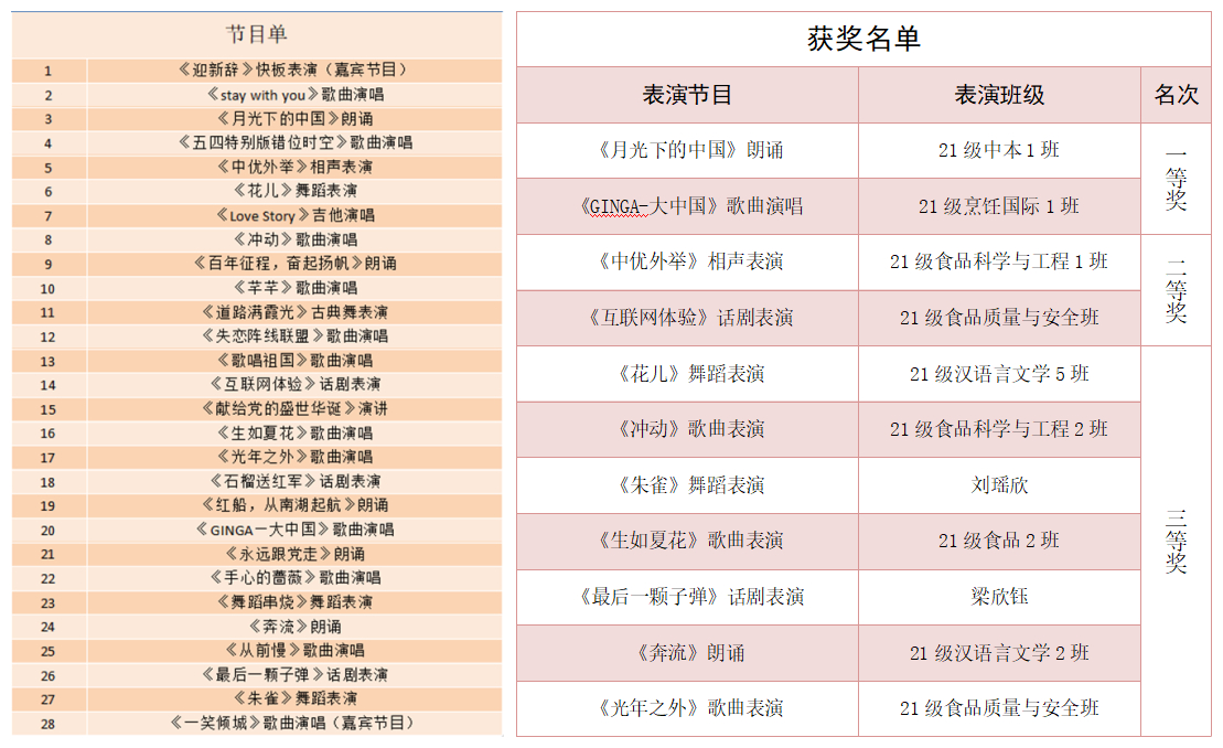 11月7日下午,食品科学与工程学院联合文学与传媒学院于鸿园420室举行2021级新生才艺大赛。担任本次大赛的评委有文学与传媒学院团委文艺文化部部长赖佳琪和叶嘉仪、副部长彭淑雯、团委副秘赖博宁及食品科学与工程学院文艺部部长冯苇、副部长张晓霖。本次大赛由21级食品质量与安全班的刘锐及吴素钰主持。