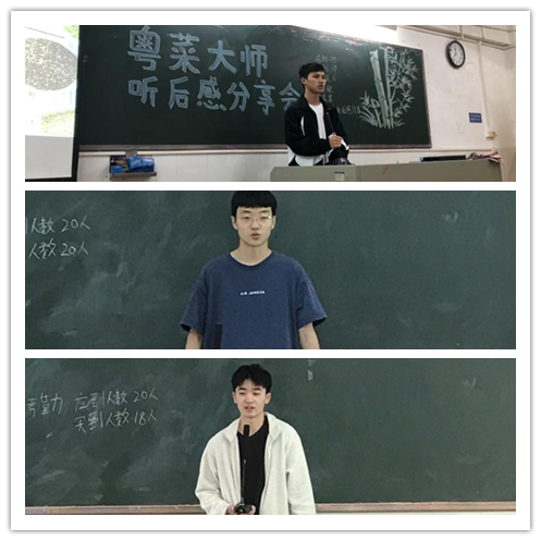 分享会上,各班级同学积极参与,班长带领同学们回顾讨论了“粤菜大师讲堂”的精彩内容,同学们一起探讨大师们的成功密码,重温了大师们的成功历程与宝贵建议,纷纷分享自己的感悟与规划。
