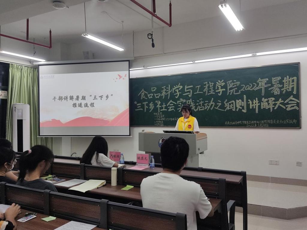 为促进2022年暑期“三下乡”社会实践活动顺利进行,5月29日,食品科学与工程学院团委社会实践部于第五教学楼B栋510开展食品科学与工程学院2022年暑期“三下乡”社会实践活动之细则讲解大会。出席本次会议的有党委副书记刘淑芬、团委指导老师姚其元、团委秘书团成员严咏欣以及20级实践委员、21级生活委员。会议由实践部干部秦佳涌主持。