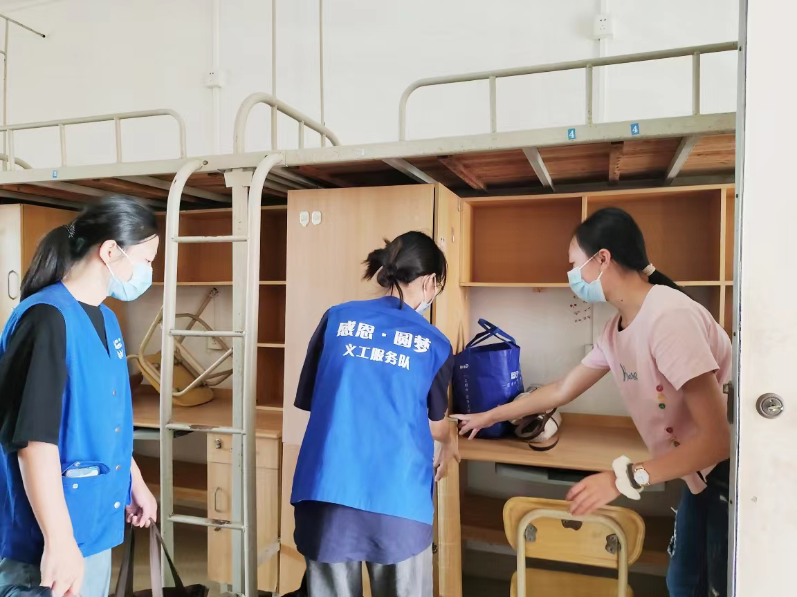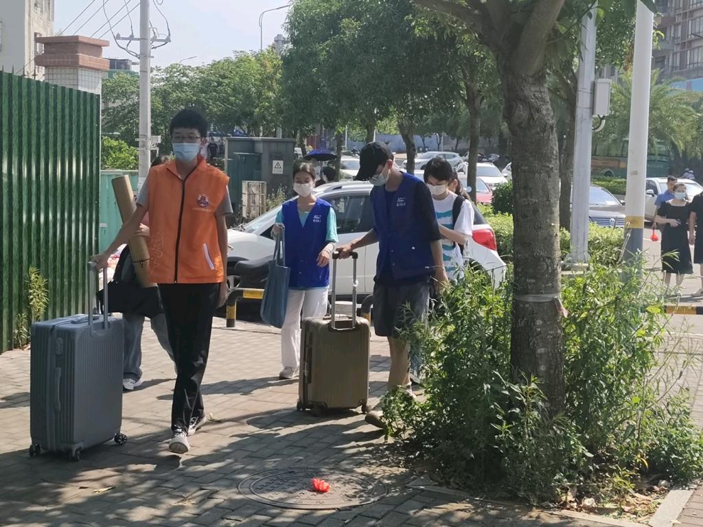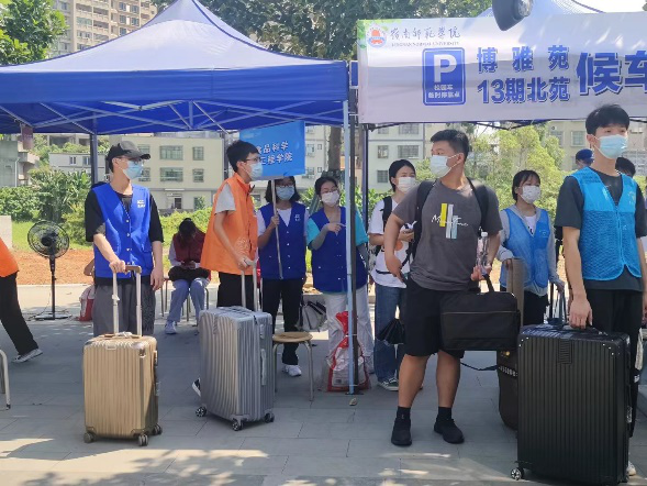 迎新使者们提前与新生联系,询问他们具体到校时间并提前在校门口等候,指引新生乘坐校园大巴到自己所属的苑区。2022级的新生们告别高中,踏入大学校园,开启大学新旅程。