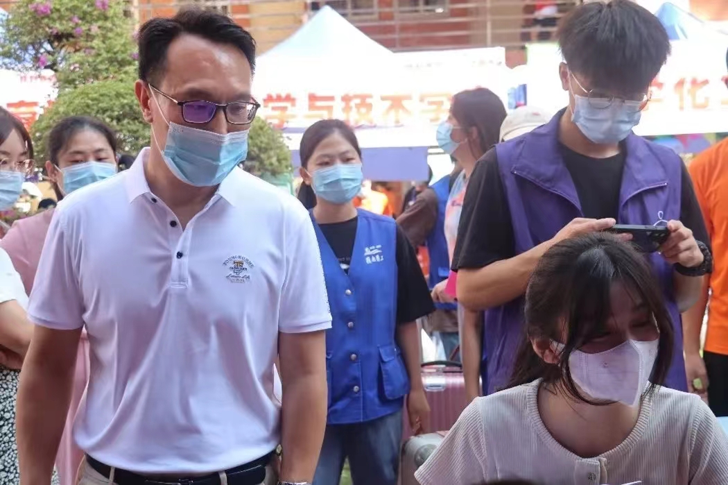邱飞来到食品学院大本营指导新生迎新工作。他对所有迎新工作人员的辛勤付出表示感谢,同时他勉励食品学院的新生们以饱满的精神面貌,用自己行动去充实大学生活,用不懈奋斗去定义属于自己的青春。