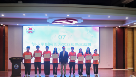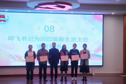 邱飞为2022级新生班主任颁发聘书;胡小军为2022级新生助班颁发聘书,现场师生精神饱满,掌声如潮。