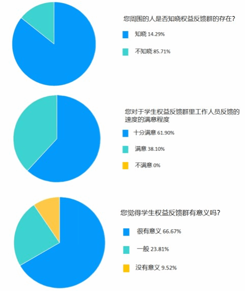 根据调查显示 ,有85.71%的同学知悉权益反馈群的存在,90.48%的同学认为权益反馈群有意义,100%的同学满意或十分满意权益部工作人员的工作态度与速度。大量数据表明权益部的工作质量属优秀水平,得到了大多数同学们的支持与赞美。同学们都纷纷表示权益部的工作是有意义的,能够切实解决日常生活中的问题。