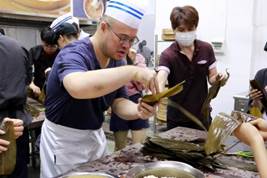 随后,学生和老师分为六组进行实践操作。活动现场充满欢声笑语,学生与老师携手制作粽子,互相学习,互相交流。一片片粽叶并合,一个个粽子下锅,飘香四溢,令人垂涎三尺。一颗颗糯米入口,一声声感叹响起,芳香扑鼻,令人赞不绝口。师生互相分享自己制作的粽子,谈论着制作过程中所发生的趣事,互相称赞着彼此的技艺。