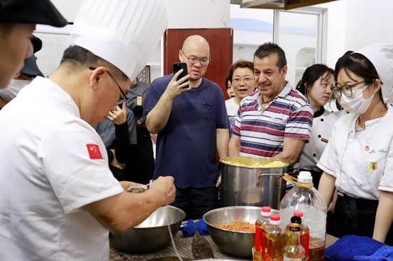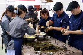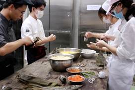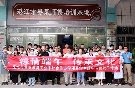 为进一步培养烹饪与营养教育专业中外合作办学项目学生的家国情怀,对中华传统节日礼俗的传承与弘扬,6月21日下午,食品学院于烹饪与营养教育专业实训室中餐室(鹏园负一楼)举行以“粽情端午,传承文化”为主题的中外合作办学项目学生端午节包粽子活动,出席活动的有国交处外教老师,学院党委书记邱飞、副院长王标诗(主持行政全面工作),党委副书记刘淑芬、副院长胡小军,烹饪大师庞泽翀,外教Joseph、Alkim,部分专业教师以及辅导员和中外合作办学项目各年级学生。
