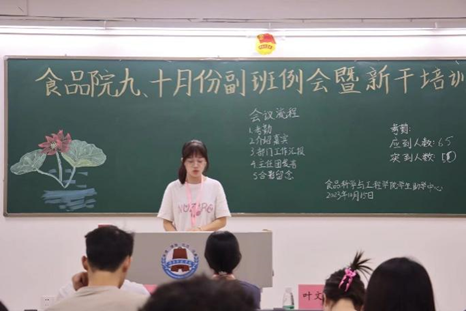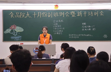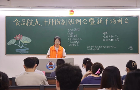 为保障工作的平稳运行,加强各部门与副班之间的沟通,10月15日下午,食品学院学生助学中心于第五教学楼A栋214室召开副班例会,参与会议的有正职负责人蔡雨顺、副职负责人叶文静、许俊瑾,会议由22烹饪国际2班庞嘉锐主持,各班级副班及助学中心全体干部参加本次例会。