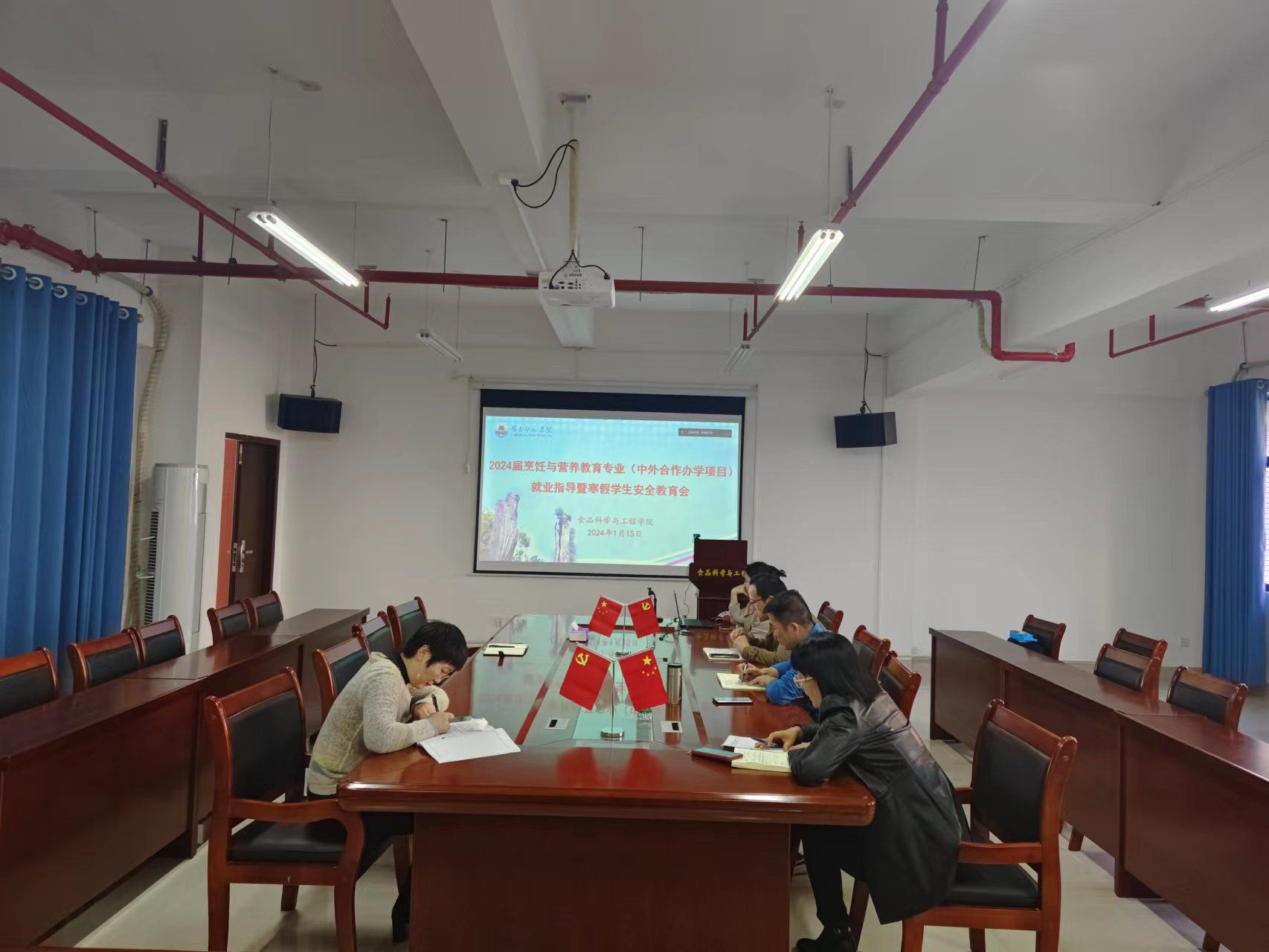 1月15日下午,食品科学与工程学院于第五教学楼B栋318室举行2024届烹饪与营养专业就业指导暨寒假学生安全教育会议。参会人员有党委书记邱飞、副书记刘淑芬,院长王标诗,副院长黄亚芬,辅导员袁嘉渝,教师吴嘉怡。会议由刘淑芬主持。