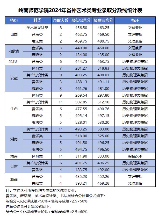 岭南师范学院2024年省外艺术类专业录取分数线统计表