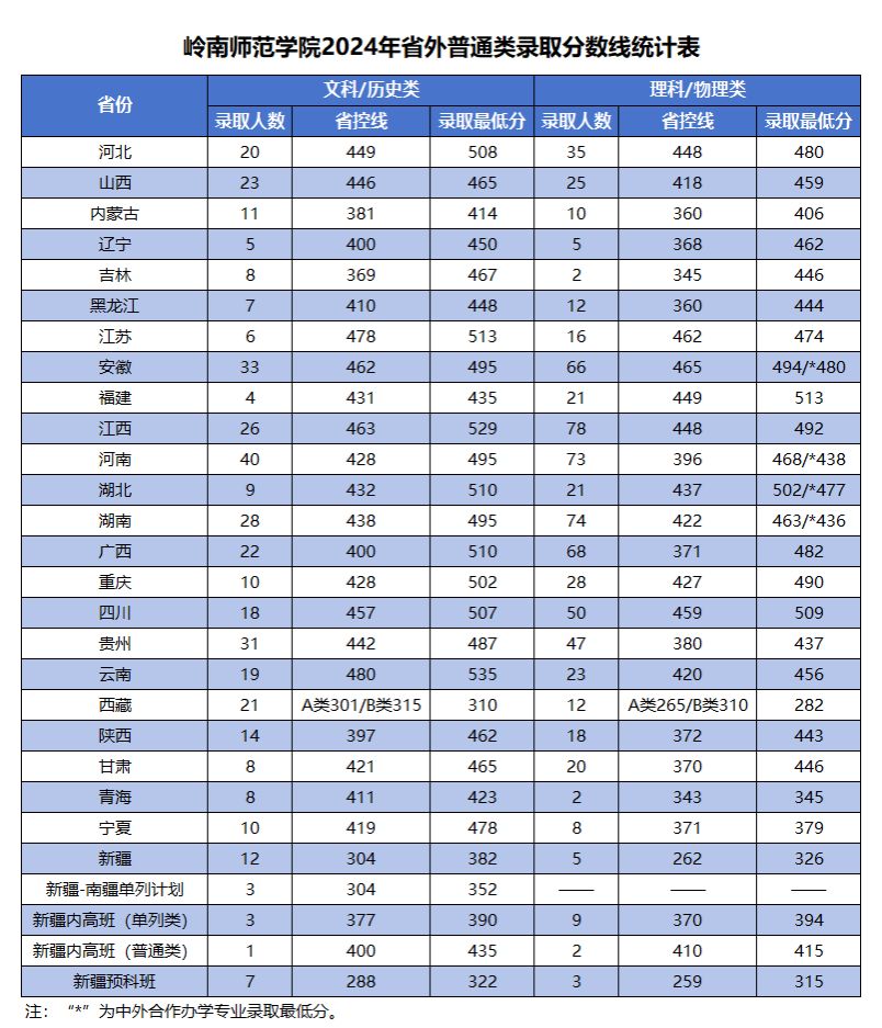 岭南师范学院2024年省外普通类录取分数线统计表