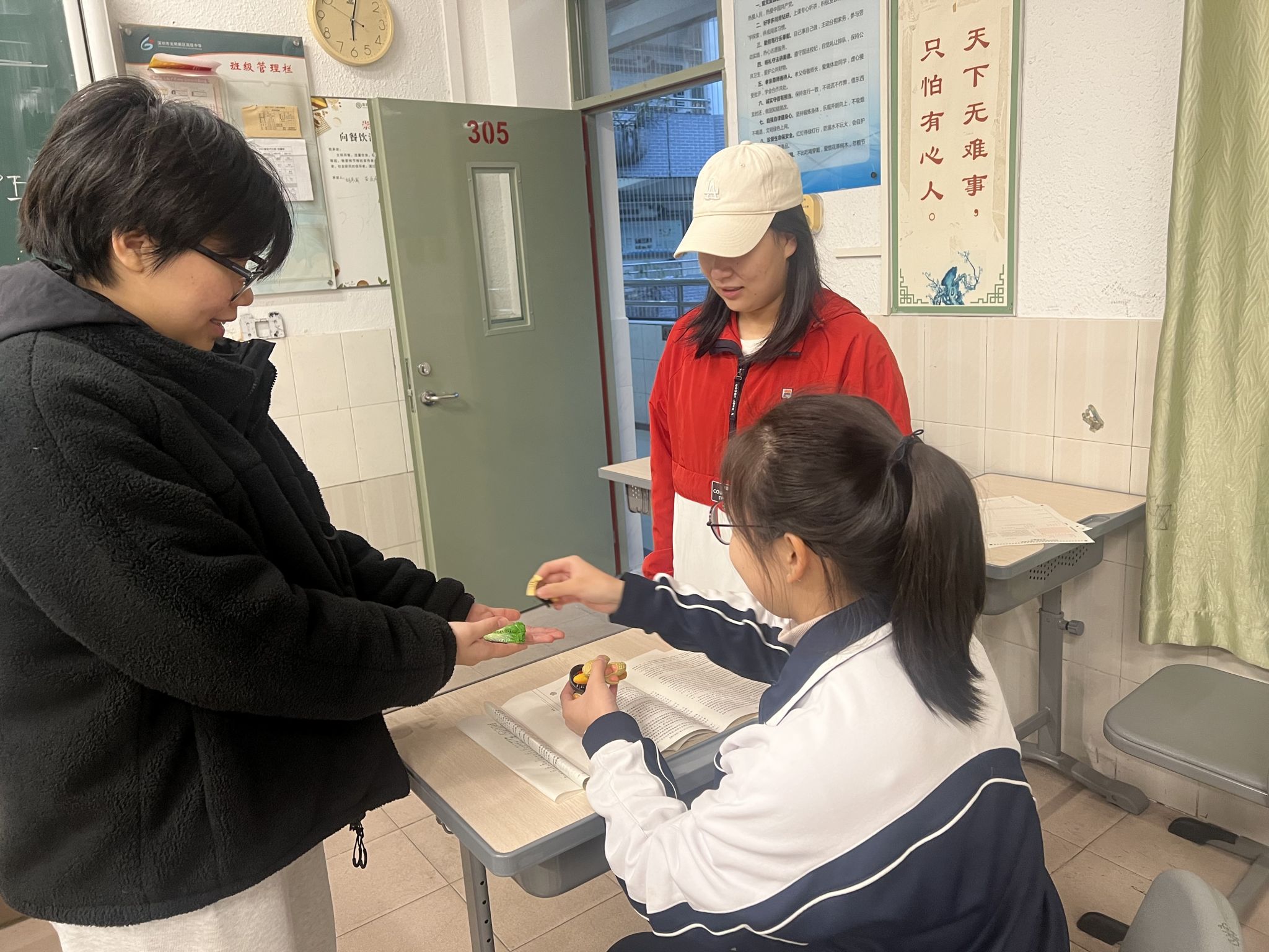 邓丽燕、骆雨萱为高三考生发放我校纪念品