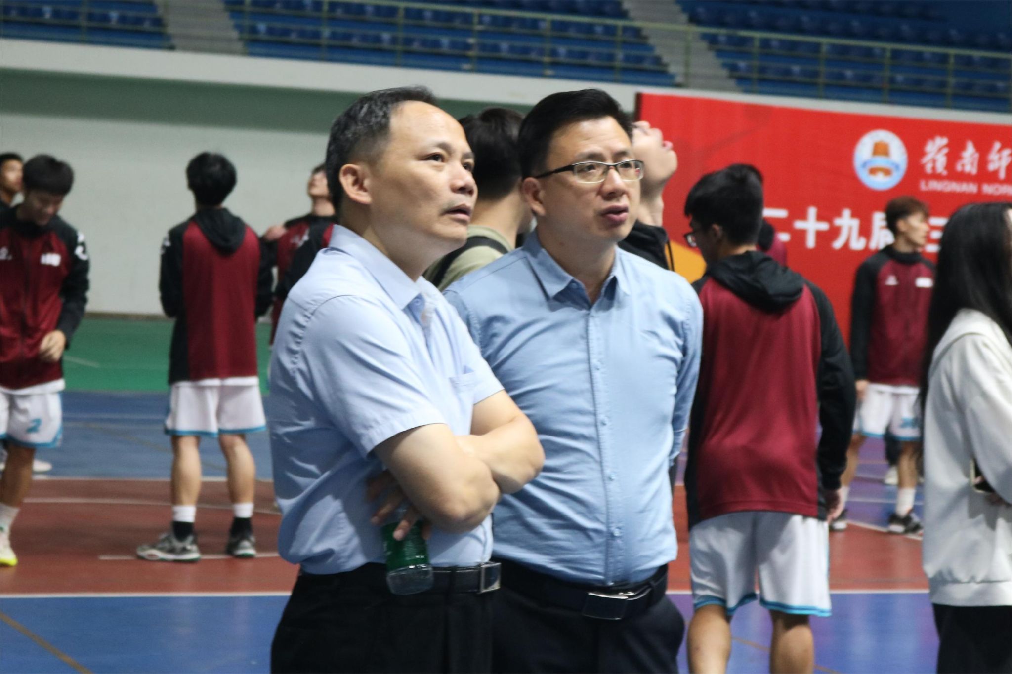 何等浩(左)与谢明亮(右)观看比赛(摄/凌金婵)