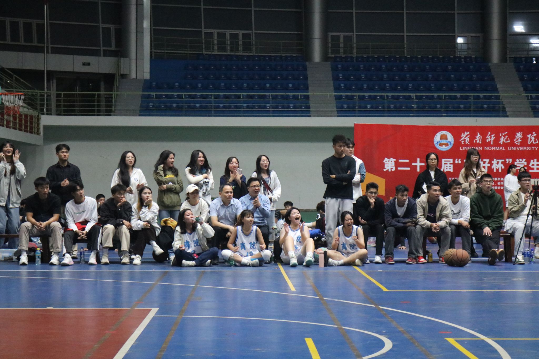 中场休息时间,教练员们关注场上赛况,分析比赛局势,适时做出战术调整。队员们互相鼓舞激励,现场的观众们拉起横幅,加油助威。在这个热血沸腾的晚上,每个人的心情都被比赛牵动着,活力四射的商院学子,成为点燃现场活力的火炬。