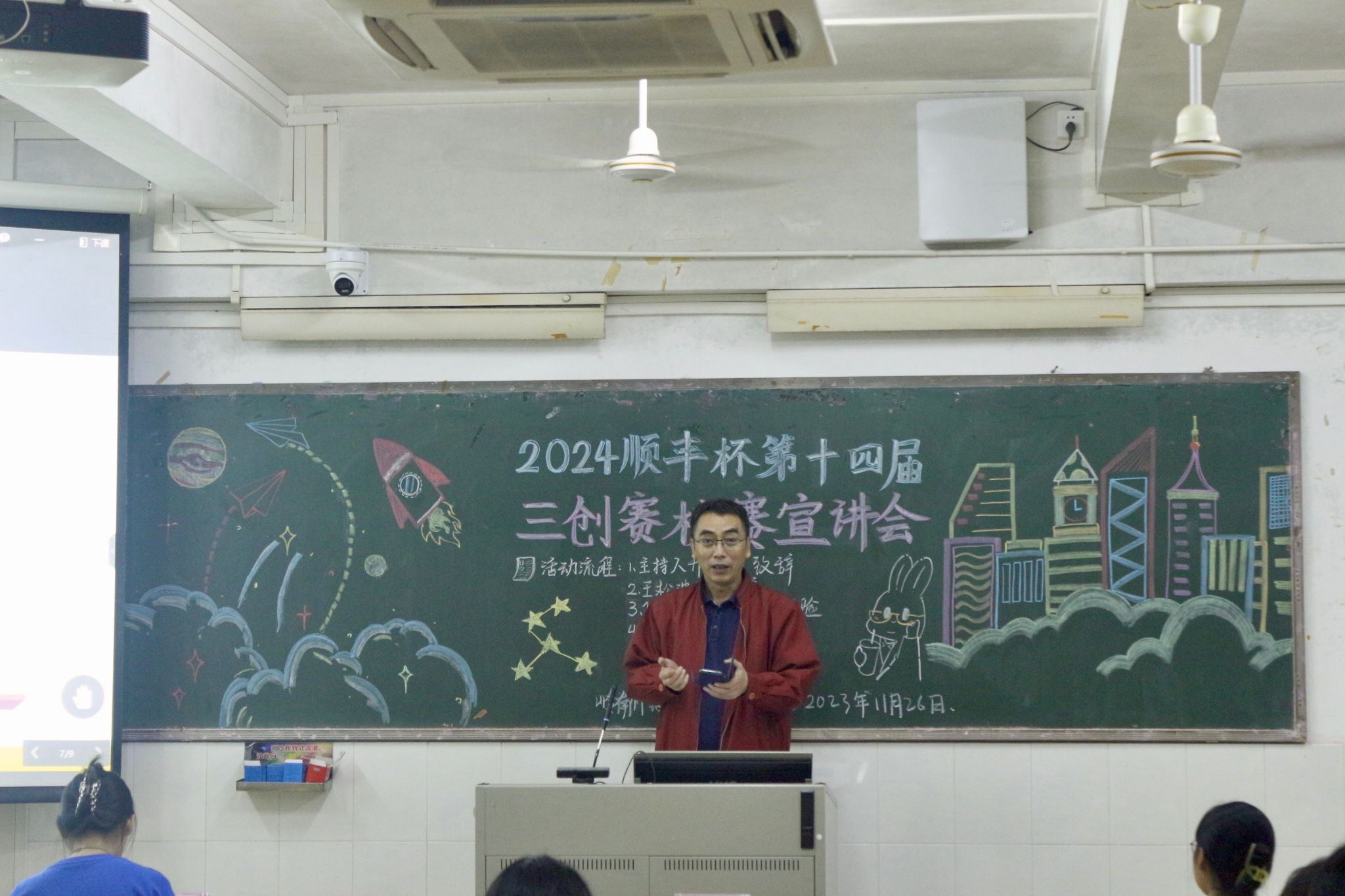 主持人开场致词后,王松波老师上台进行发言,他向同学们表明了“三创赛”的重要性以及提到了参赛的注意事项,详尽地说明了比赛的流程和要求,并列举了一些成功的电商创业案例。参会人员认真聆听,以获得丰富的比赛资讯。
