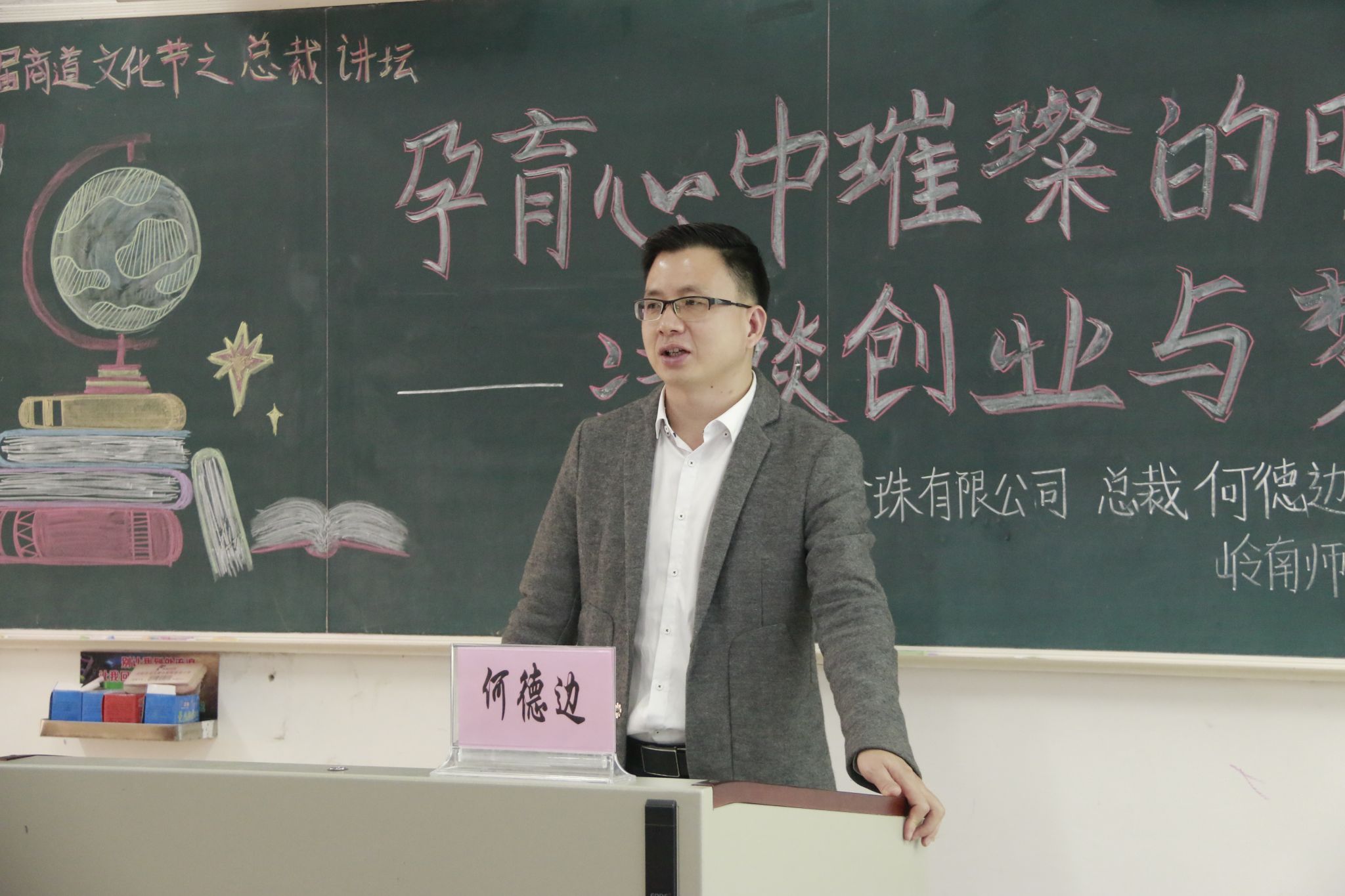 谢明亮表示非常感谢广东尊鼎珍珠有限公司总裁何德边先生为商学院学子分享了一场精彩的创业故事,也鼓励同学们要持有创新创业意识,不断提升自身能力,成为一名优秀的商科人才。希望同学们经过本次商道文化节的举办,能够传承并弘扬商道文化。