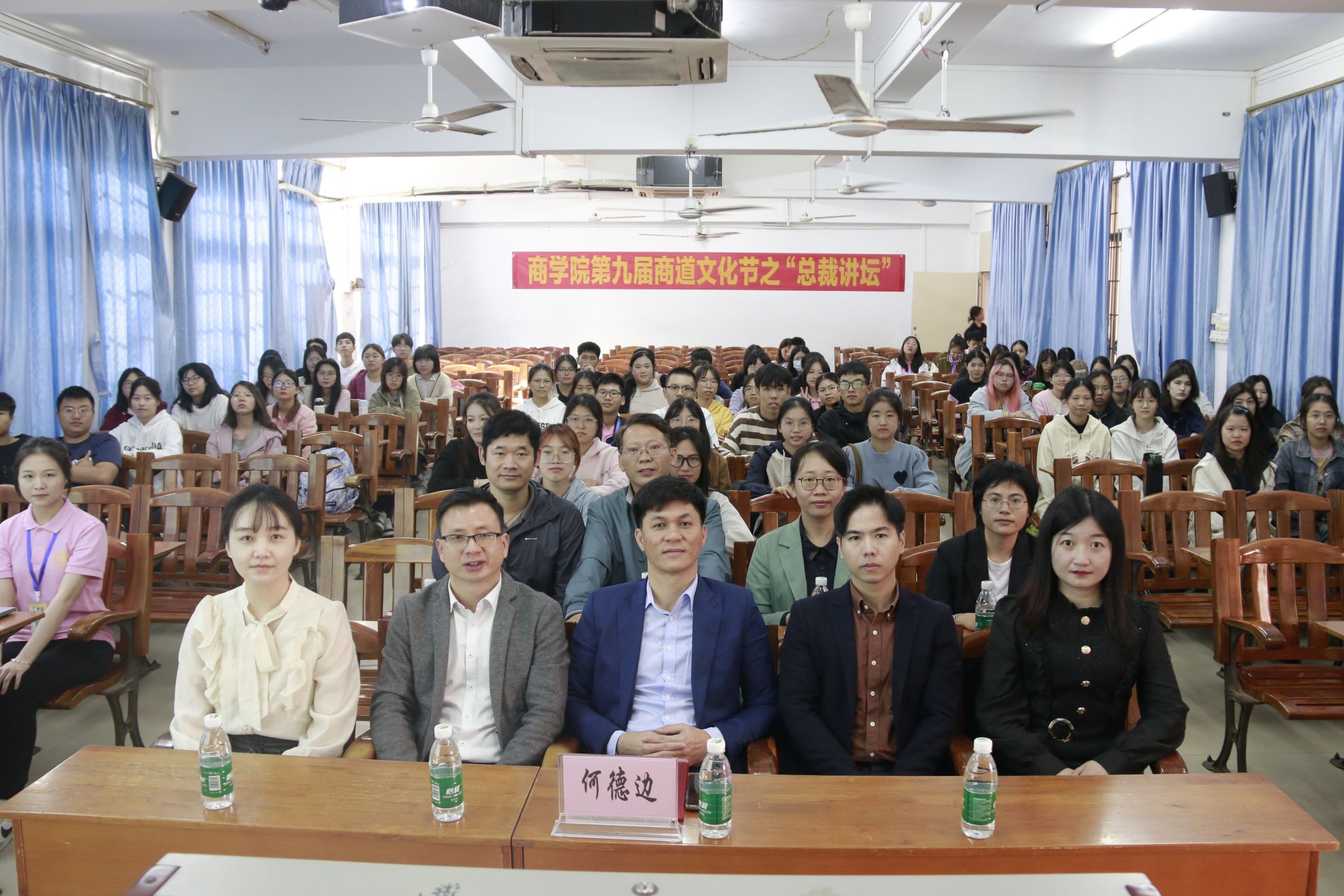 继商道文化节开幕仪式后,于弘雷楼203室开展“总裁讲坛”。本次讲座邀请了广东尊鼎珍珠有限公司总裁何德边先生进行“孕育心中璀璨的明珠——浅谈创业与梦想”主题分享。商学院党委副书记谢明亮、会计系主任范宇、会计系副主任邓一彤、刘长军老师、陈欢老师,2021级辅导员周璇出席本次互动。2022、2023级工商管理专业全体学生参与本次讲座。