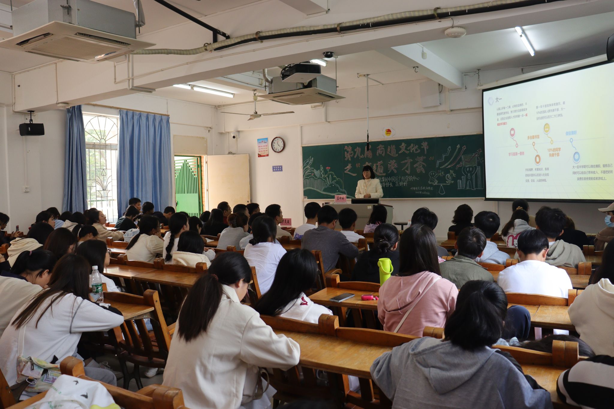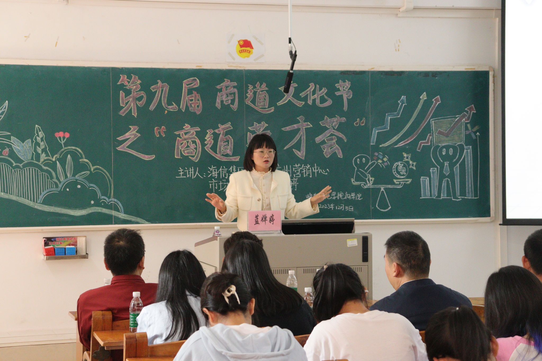 12月3日,岭南师范学院商学院第九届商道文化节活动正式开幕。商道文化节系列活动之“商道英才荟”活动讲座于弘雷楼208室成功举办。本次活动邀请到商学院2012届电子商务专业优秀毕业校友、海信集团中国区州营销中心市场部部长蓝婵婷女士作为主讲嘉宾,为2022级和2023级市场营销专业全体学生带来一场精彩演讲。商学院营商系主任王松波老师、辅导员梁海灿老师、刘灵瑶老师出席本次会议。