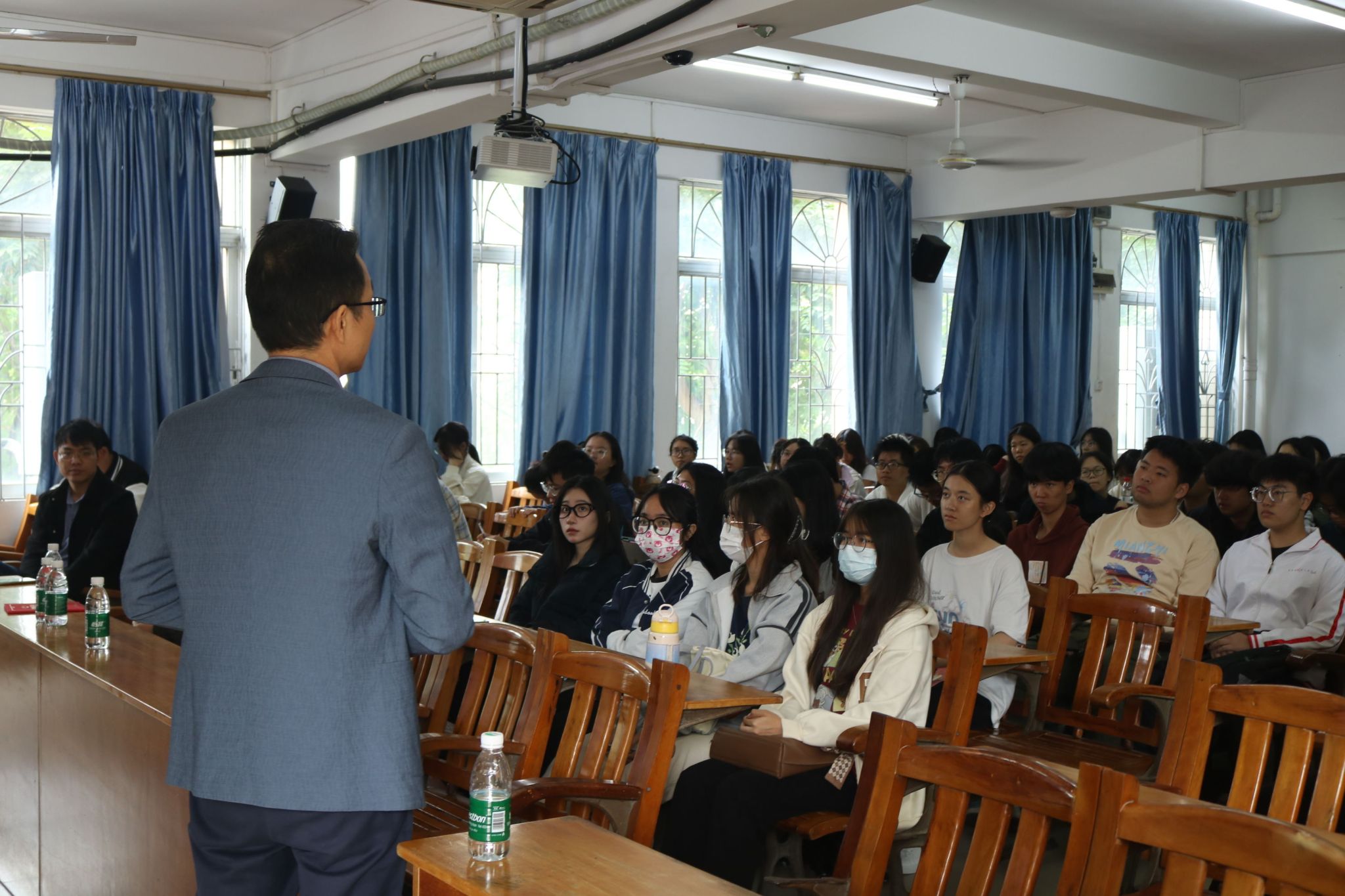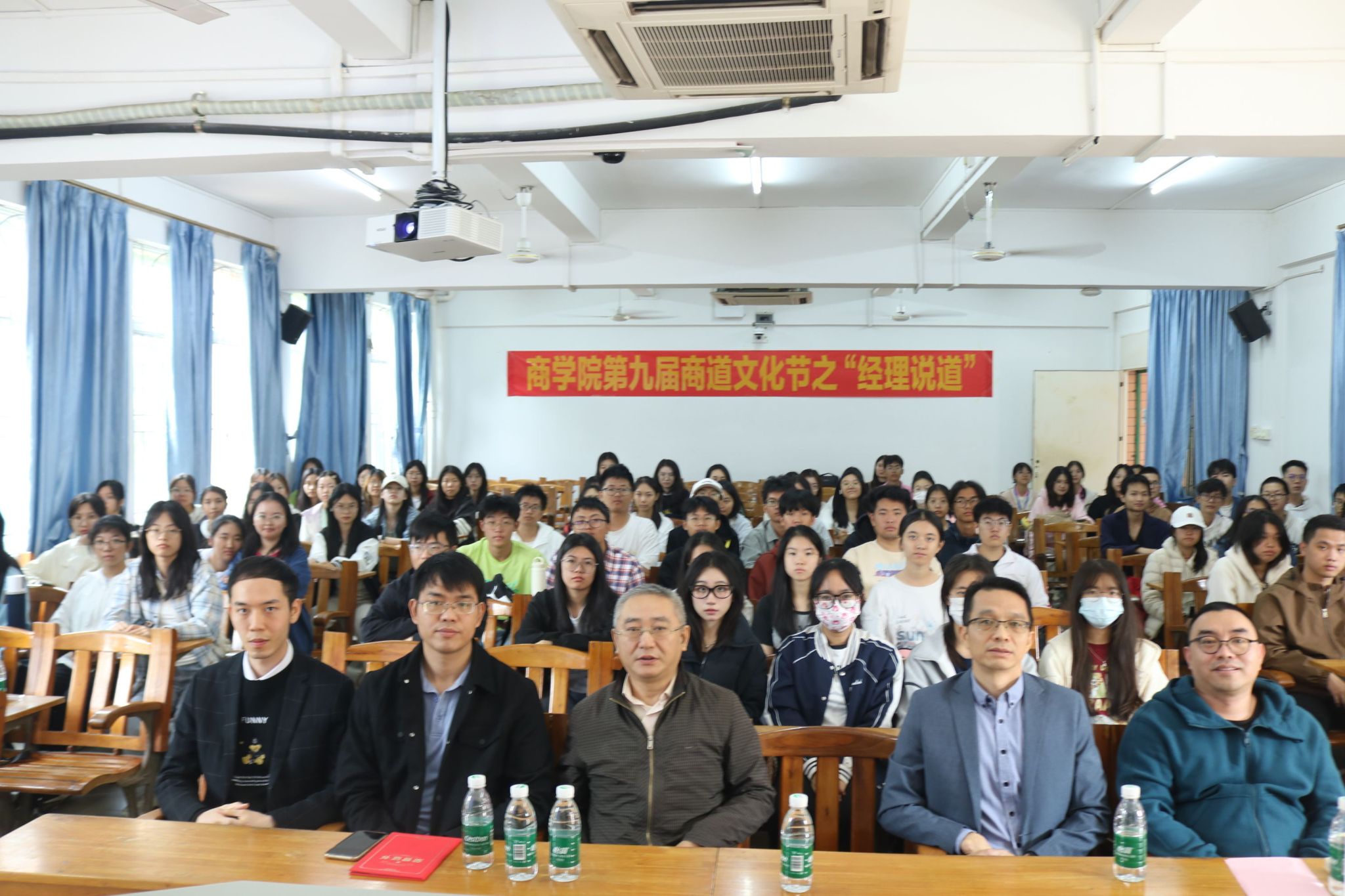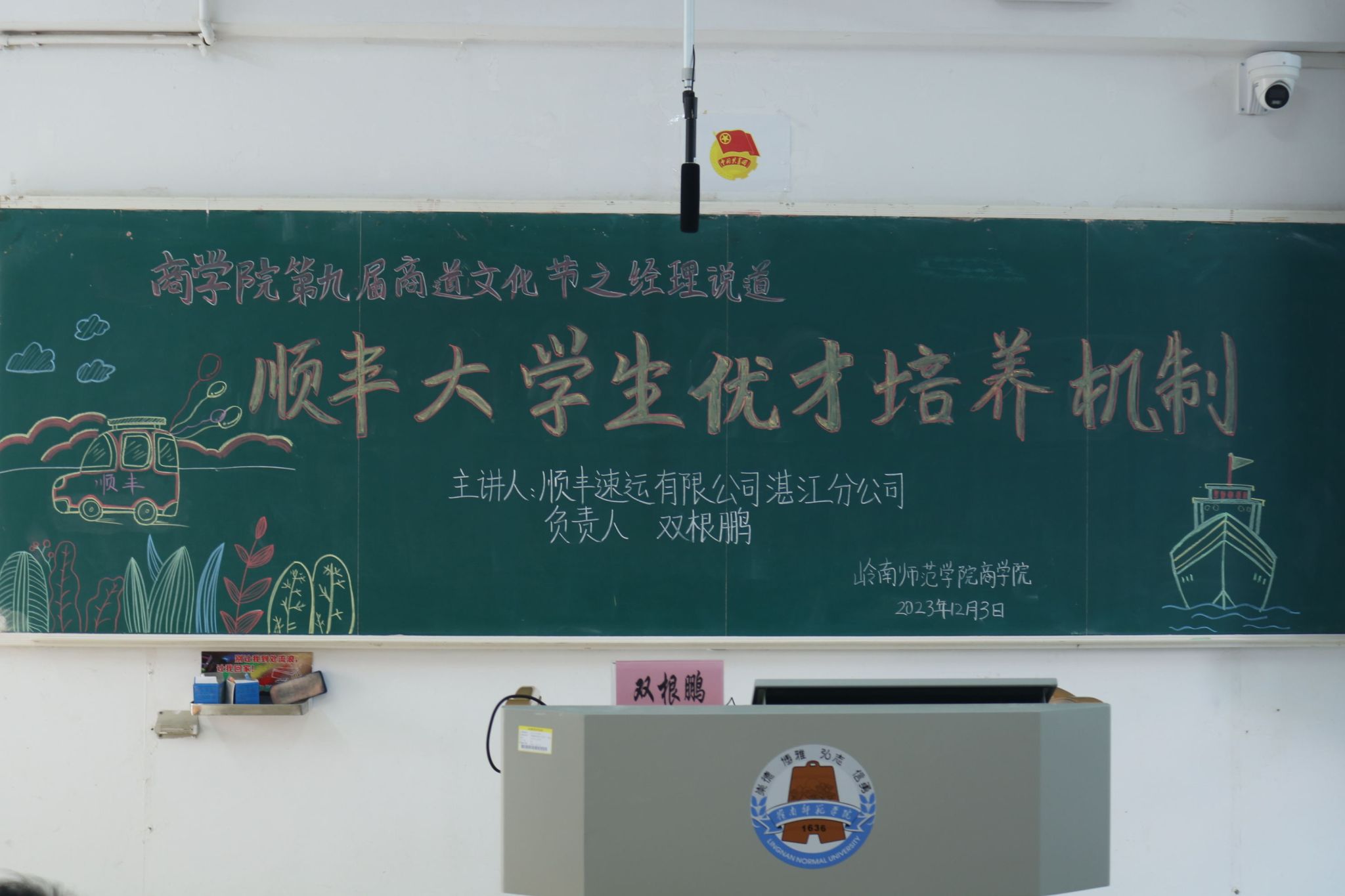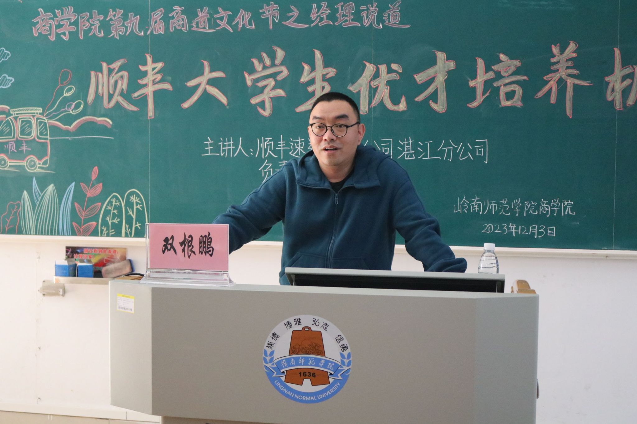 12月3日,商学院于弘雷楼207室举行第九届商道文化节之“经理说道”讲座。顺丰速运有限责任公司湛江分公司负责人双根鹏先生主讲,商学院院长许抄军、商学院工管系主任欧进峰、专业教师徐延利、郑济坤、辅导员钟灵出席本次会议,2022级国际经济与贸易、2023级国际经济与贸易学生参加本次活动。