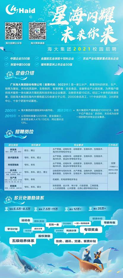 海大集团2021校园招聘,广东海大集团股份有限公司是中国的500强企业,全国前五全球前十饲料企业,农业产业国家重点龙头企业