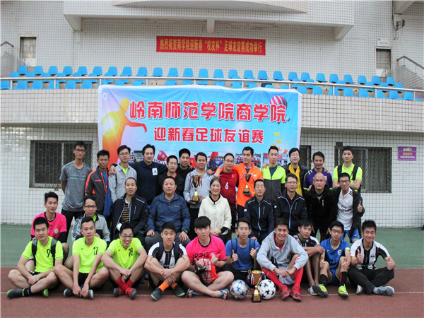 12月31日下午,商学院迎新春足球友谊赛在新区足球场拉开序幕。商学院党委书记李爱群、党委副书记李海文、副院长梅晓仁、陈欢老师、梁康建老师亲临现场为运动员加油打气。