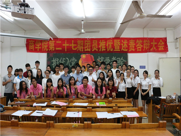 为响应党的号召,加强对团员的培养与教育,提高团员的思想道德素质,11月21日晚,岭南师范学院商学院于燕雷楼606教室举行了第二十七期团员推优暨述责答辩大会。商学院党委李干书记、辅导员杨文杰老师,校团委组织部干部,商学院团委秘书长团、党建办干部代表以及72名推优对象出席了本次大会。