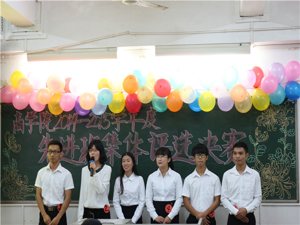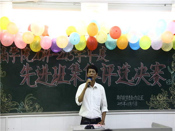 11月15日晚,商学院于燕雷楼811室举行2014—2015学年度“先进班集体”评选决赛,商学院党委李干书记,辅导员杨文杰老师、陈幕飞老师,商学院学生会主席团、团委秘书长团、各大中心主任、校办公室干部以及各二级学院办公室干部出席了本次评选决赛。