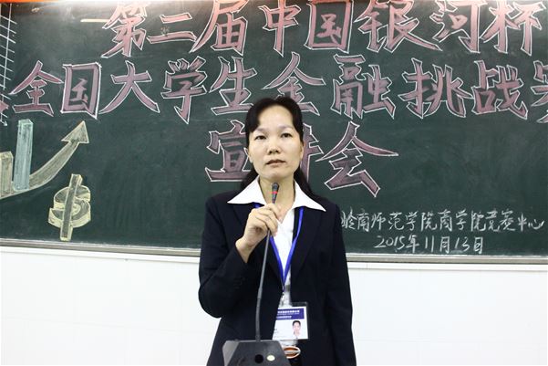 11月13日晚,由中国银河证券公司主办,岭南师范学院商学院竞赛中心协办的第二届中国银河杯全国大学生金融挑战赛宣讲会于燕雷楼605课室正式拉开帷幕。中国银河证券湛江营业部副总经理邱美英、中国银河证券湛江民有路营业部区域经理李雪梅和万得资讯大赛推广负责人麦碧如应邀出席本次宣讲会。
