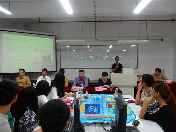 为培养学生的创新合作意识,使学生在模拟企业资源运行状况的过程中领悟企业的运营理念,培养团队精神,10月22日晚,岭南师范学院erp沙盘协会成立大会在燕雷楼e栋202室召开。校团委郭和才书记,莫然老师,商学院李干书记,梁晋副书记,辅导员董芬老师,erp沙盘协会指导老师陈智崧老师和孙毅老师,以及校社联部代表,商学院团委代表,学生会代表,社团部代表及新闻中心的代表出席了本次大会。