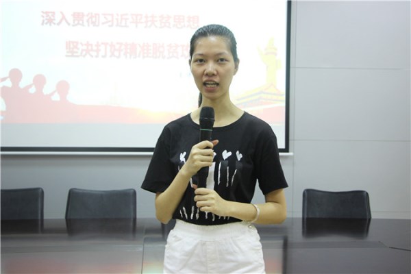 孙东燕同志带领同学们从五个方面学习了“精准扶贫”主题:一是指出扶贫开发的六个重要性;二是国家实施精准扶贫的工作指导思想;三是讲述“六个精准”,解决“四个问题”的核心内容;四是“五个一批”的实现路径。她通过雷州市乌石镇那毛村番薯及山东菏泽甄城县懒汉兄弟做豆腐的扶贫两个真实的案例讲解,使同学们对国家的精准扶贫政策有了深入的了解。最后,她号召大家坚定信念,努力学习新时代新思想新理论,不断地丰富知识,最终学以致用,并且积极投身于家乡的建设中去。