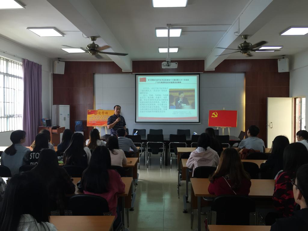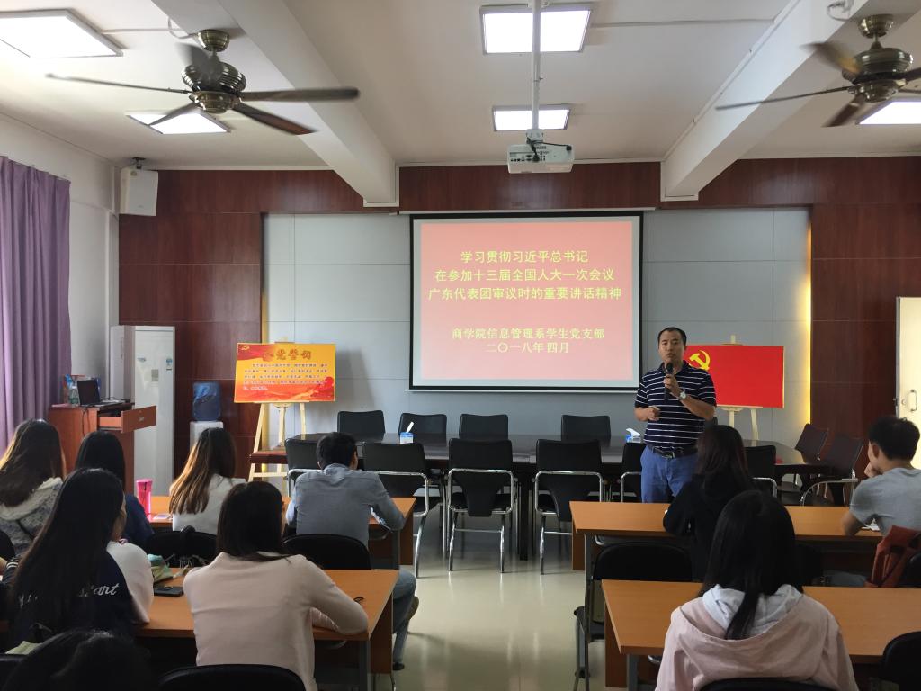 4月17日,商学院信息管理系学生党支部在燕雷楼306室召开主题为“学习贯彻习近平总书记在参加十三届全国人大一次会议广东代表团审议时的重要讲话精神”党课,本次党课由支部书记梁康建主讲,支部党员及入党积极分子参与了本次党课学习。