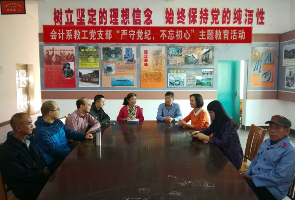 随后,大家在敦文文史馆进行座谈。李爱群书记首先表示,此次主题活动很有意义,希望党员们向先烈学习,树立坚定的理想信念,永葆共产党员的先进性和纯洁性,然后,向党员们传达十八届六中全会精神,并要求会计系教工党员同志在教学工作岗位上,严守党纪,不忘初心,争当合格、优秀党员。全体党员畅所欲言,谈感想、谈心得,纷纷表示,将以此次活动为契机,铭记先烈奋斗不止的革命精神,严守党纪,不忘初心,做好本职教学工作,以饱满的工作热情,迎接学校的本科教学审核评估工作。