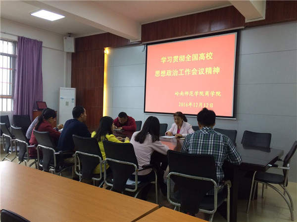 12月14日下午,商学院党委李爱群书记在学院会议室主持召开了商学院全体教职工会议时,再次与全体教职工集中学习了全国高校思想政治会议讲话精神。学习会上,商学院夏青院长强调,习近平总书记的重要讲话,是新时代高校思想政治工作的出发点和立足点,我们要坚持把立德树人作为工作的中心任务,将思想政治工作贯穿教育教学全过程,加强师资队伍建设,推进教育教学改革,提高人才培养质量。