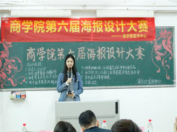 为全面拓展大学生综合素质,培养同学们的创造力和团队协作能力,11月20日晚,商学院在燕雷楼313室举办了第六届海报设计大赛。本次大赛邀请到商学院宣传中心指导老师李春霞、美术与设计学院学生会副主席、摄影协会影视组组长任科鑫、15级视觉传达设计2班班长贾真君以及钟秋明担任大赛评委。