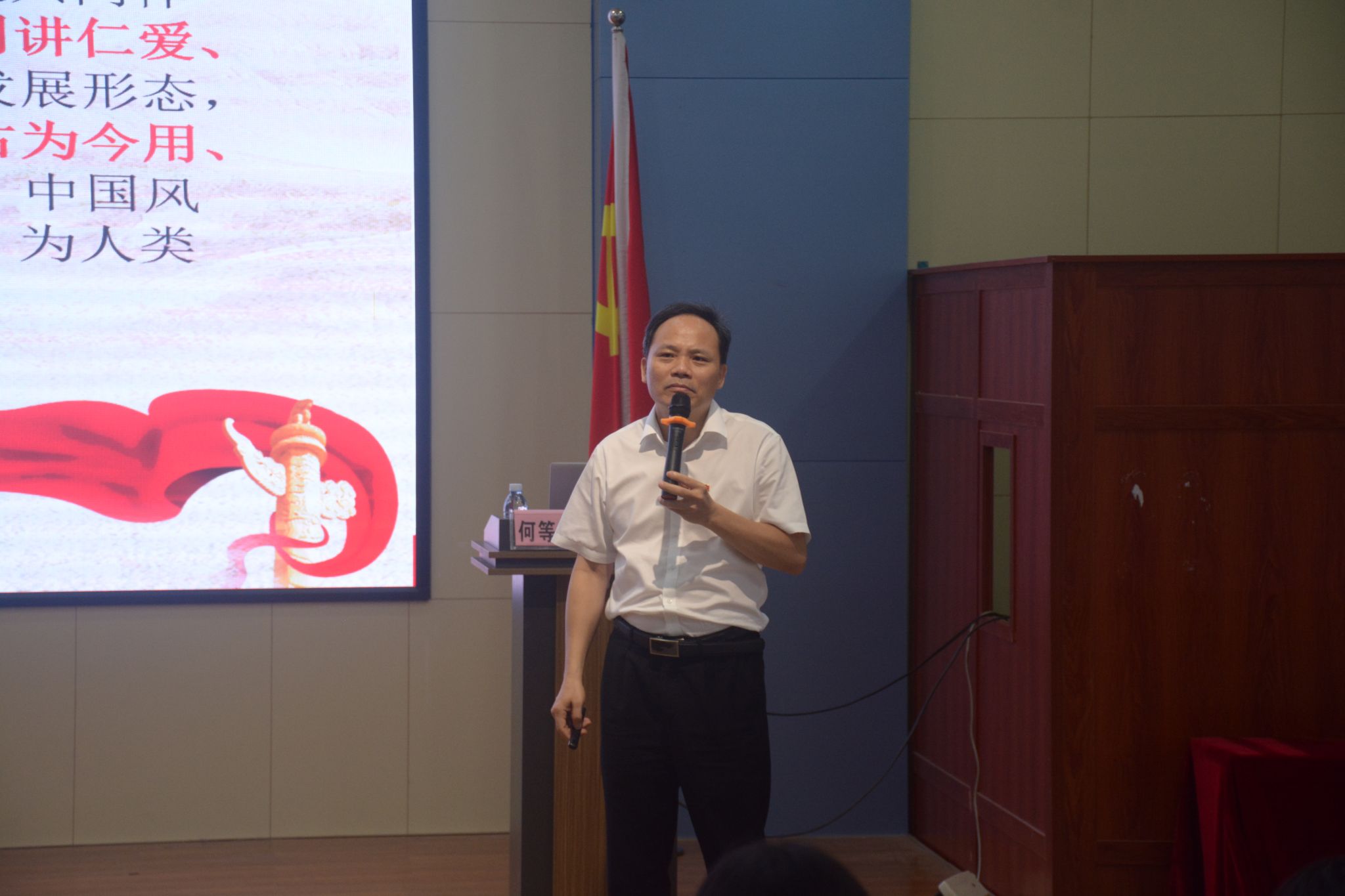 何等浩指出,马克思主义中国化的过程,是将马克思主义基本原理与中国具体实践和中华优秀传统文化相结合的过程。这一过程不仅推动了马克思主义在中国的发展,也为中国特色社会主义事业提供了强大的精神动力和文化支撑。最后,何等浩向党员发展对象提出了三点希望:一要加强党史、新中国史、改革开放史、社会主义发展史、中华民族发展史等“五史”学习,坚定文化自信;二要明大德立大志——心系国家民族,传承好中华优秀传统文化;三要听党话跟党走——勇于担当作为,为实现中华民族伟大复兴而发奋努力。