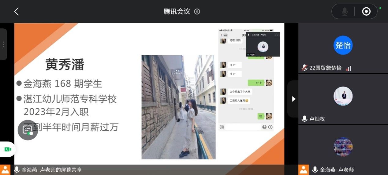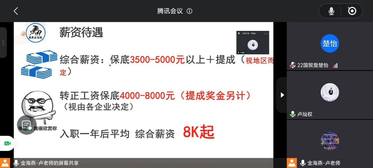 继商学院“优择业、就好业”学生就业风尚,为拓宽2026届毕业生就业择业渠道,商学院于2025年9月19日下午3点举办广东金海燕进出口服务有限公司校园招聘专场线上宣讲会。广东金海燕进出口服务有限公司宣讲会负责人卢灿权、商学院负责就业工作辅导员钟玲、2026届国际经济与贸易专业毕业生参加本次会议。